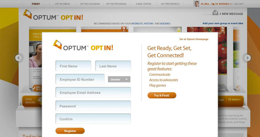 In conjunction with Medulan, Figmints scoped a new way to introduce employees to the healthy living social media platform that was desperately needed. The metaphor of posters was used again through interactive poster windows that conveniently came across the users’ screen. These “digital posters” had the ability to showcase videos, display quick survey questions as well as simply inform for upcoming events. The bright and exciting user interface gave a refreshed presence that Optum had in their own company, moreover the entire application can be skinned just by changing a main color and background image for any of their subsidiary clients for licensing purposes.