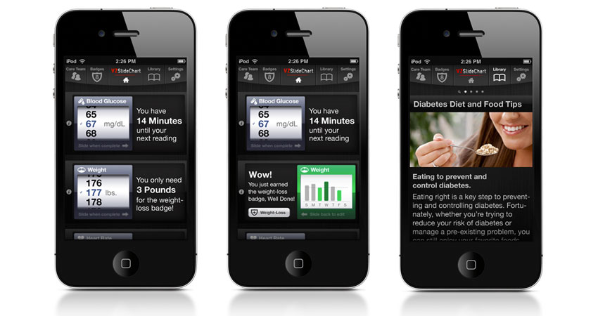 An intuitive user interface and user experience that would excite users to engage multiple times a day. Before we architected and designed the VZSlideChart, users had to input information about their blood glucose, weight and other diabetes information several times a day. We found that the two most innovative, and easy-to-use interface systems from the newly minted iPhone were the swipe-to-unlck, and scroll features. We combined these simple gestures to eliminate that need for traditional data entry on a mobile device and wrapped it in a UI that begged to be used.